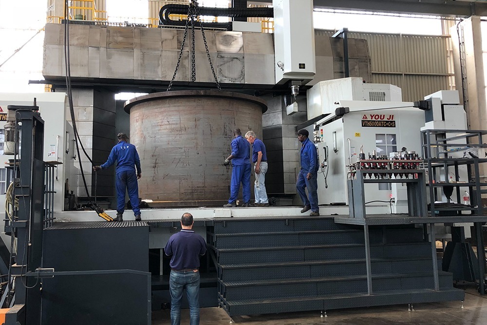 We regularly process equipment manufactured for stacker reclaimers, slewing drives, luffing arm pivots, and bucket wheel drives, as well as drives for trommels, mills, and kilns, debarking drums, and sector gears. In addition to CNC milling stations for shaping, milling, and drilling of large flat products up to 3.2 m in diameter, we have vertical turning lathes with both CNC and traditional control. CNC control allows for shaped finishes profiles and internal bore turning of bores and drums with limited operator access.